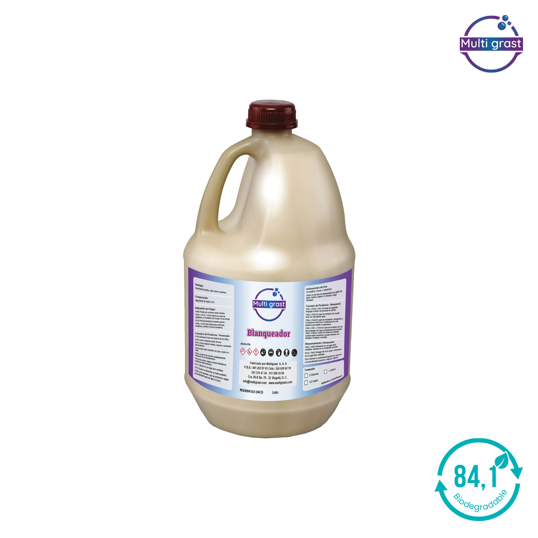 El Blanqueador Hipoclorito al 15% Multigrast desinfecta, desmancha y blanquea baños, pisos, paredes y ropa con una concentración superior a la de los blanqueadores del mercado. Su fórmula de alto rendimiento elimina bacterias, hongos y malos olores en una sola aplicación. Rinde más por litro, siendo la opción más económica para hogares, empresas y entidades que exigen higiene profunda.